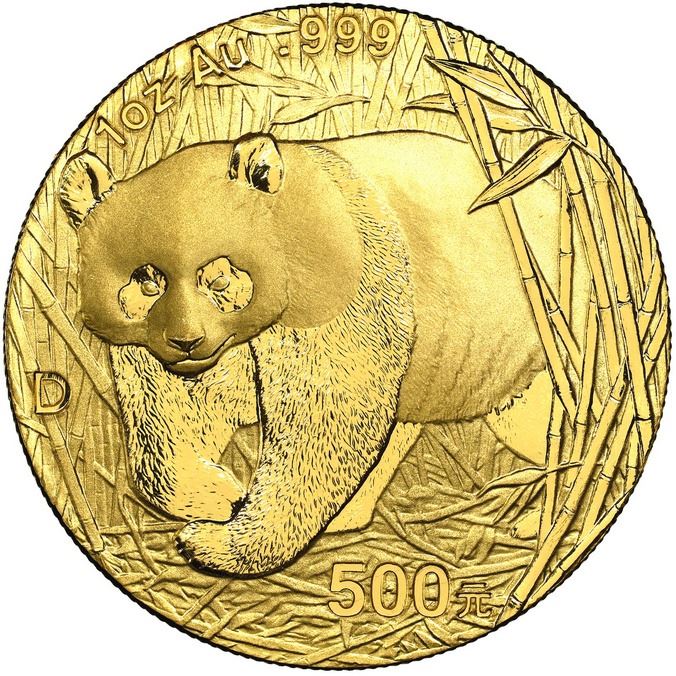 China (People's Republic), gold 50 yuan (1/10 oz) Panda, 2001 D, NGC MS 69. KM-1367; PAN-344A. The "D" mark (used only in this year) indicated production for domestic use as opposed to export. Naturally they are elusive outside of China. Anthony: "The 2001D 50Y 1/10 oz. B.U. gold Panda has no announced mintage and it is a fairly scarce coin today." Mintage: 100,000 planned (estimated extant <4,600). Pedigreed to the Gansu Collection of Chinese Panda Coinage.