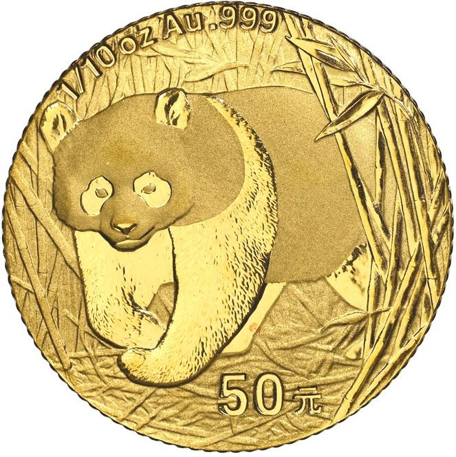 China (People's Republic), gold 50 yuan (1/10 oz) Panda, 2002, frosted bamboo (Shenzen Guobao mint),