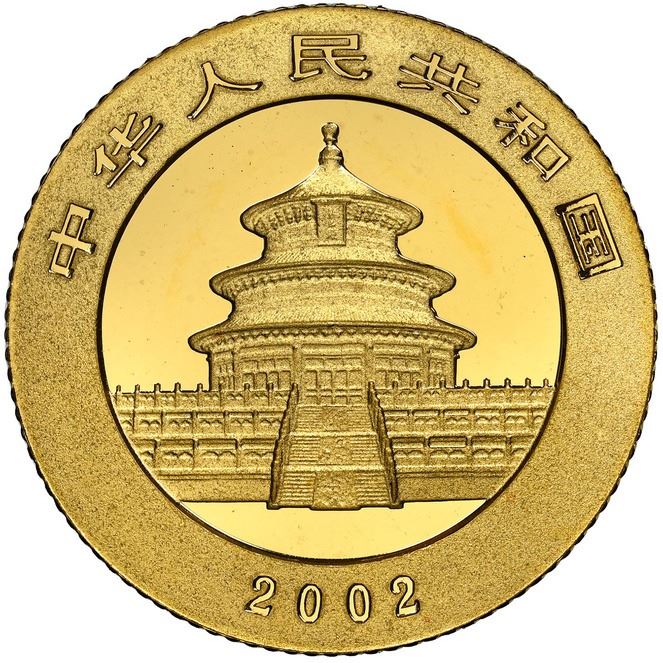 China (People's Republic), gold 50 yuan (1/10 oz) Panda, 2002, frosted bamboo (Shenzen Guobao mint), NGC MS 69. KM-1457; PAN-352B. All the MS gold of 2002 are scarce, and 2002 is a key year in general (in fact the only year to repeat the design from the previous year, albeit with a new edge-reeding that is diagonal instead of vertical). The "mirrored bamboo" versions, referring to branch tips at the rim, are accompanied by a lower neckline on the panda and indicate Shanghai mint; the "frosted bamboo" versions come from the Shenzen mint. Mintage for both mints: 150,000 planned; 36,092 actual; estimated extant (both varieties) <3,800. Pedigreed to the Gansu Collection of Chinese Panda Coinage.