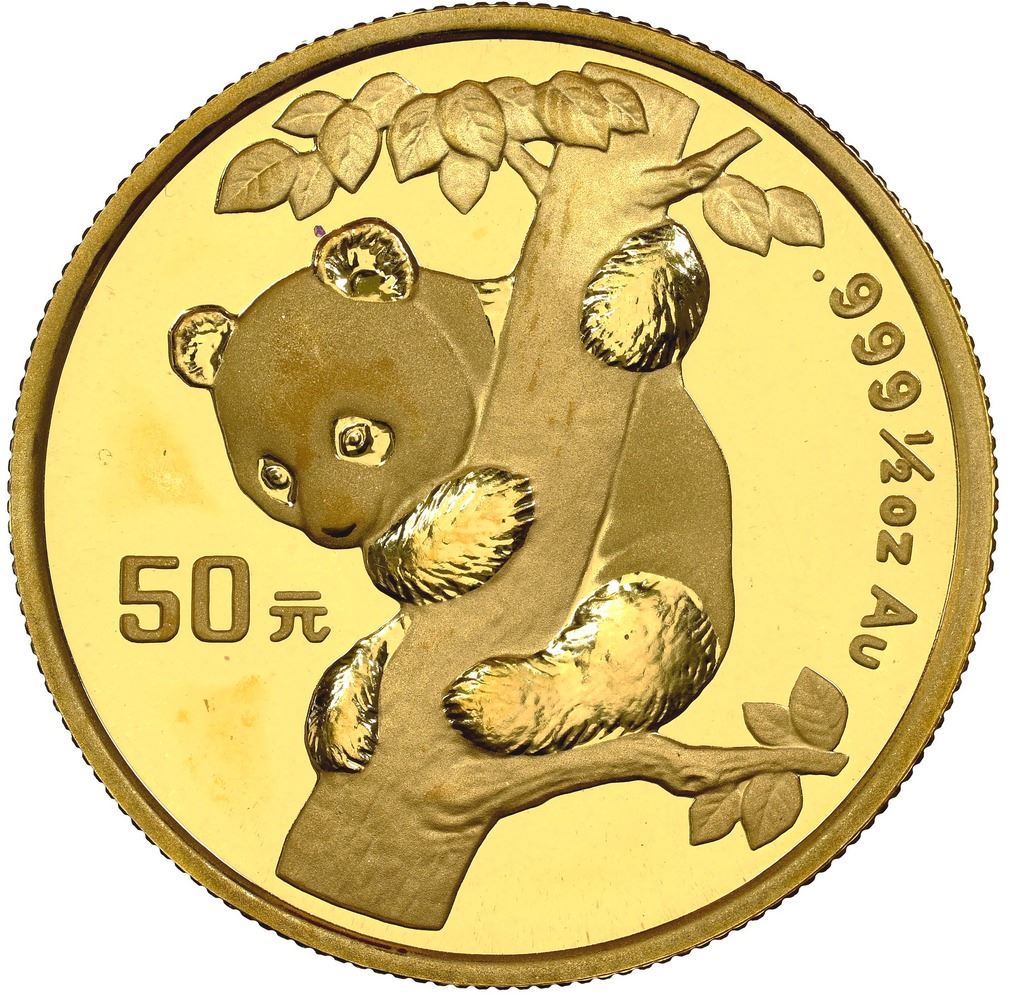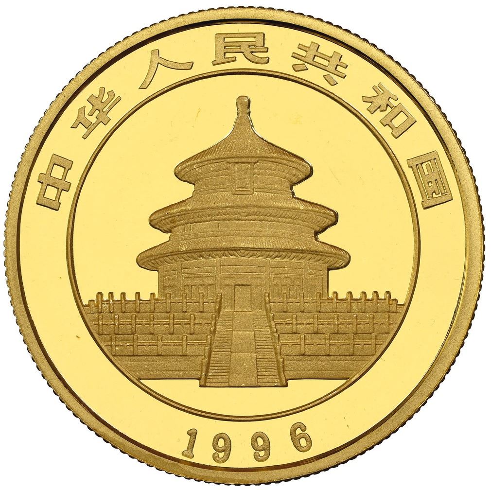 China (People's Republic), gold 50 yuan (1/2 oz) Panda, 1996, large date (Shenyang mint), NGC MS 69. KM-886; PAN-257B. Very low estimated surviving rate, with only six higher at MS 70 in the current NGC census. Note in this year the large and small dates flip-flopped mints from previous years, the small date being Shanghai and the large date being Shenyang, which continued for the following years. Mintage for both mints: 13,849; estimated extant population for this variety <750. Pedigreed to the Gansu Collection of Chinese Panda Coinage.