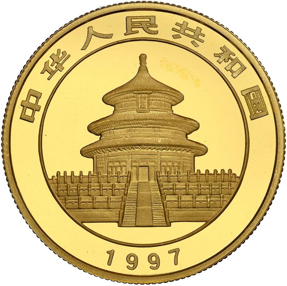 China (People's Republic), gold 50 yuan (1/2 oz) Panda, 1997, large date (Shenyang mint), NGC MS 69. KM-990; PAN-280B. Only fifteen higher at MS 70 in the current NGC census. Anthony: "The 50 Yuan Pandas are considered to be the scarcest 1997 denomination and are in very short supply." Actual mintage for both mints: 15,483; estimated extant population for this variety <2,050. Pedigreed to the Gansu Collection of Chinese Panda Coinage.