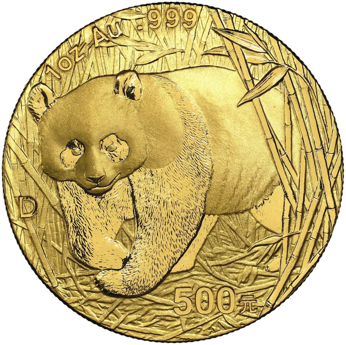 China (People's Republic), gold 500 yuan (1 oz) Panda, 2001 D, NGC MS 69. KM-1371; PAN-341A. The "D" mark (used only in this year) indicated production for domestic use as opposed to export. Naturally they are elusive outside of China. Anthony: "a scarcer coin today." Mintage: 100,000 planned; 150,000 actual; estimated extant <3,800. Pedigreed to the Gansu Collection of Chinese Panda Coinage.