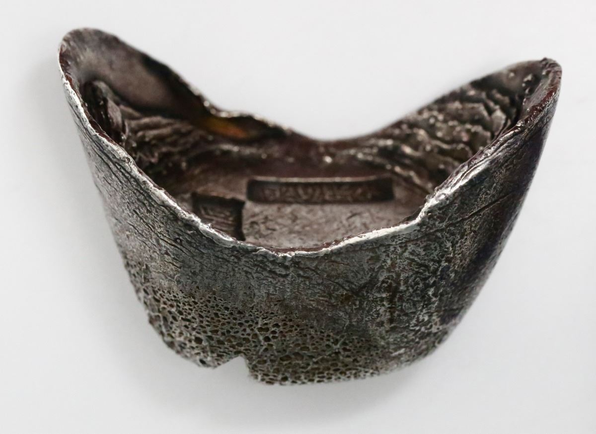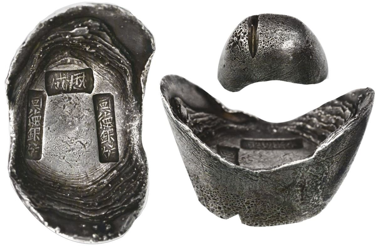 China, Shandong Province, Li Cheng county, 10 tael sycee boat-shaped ingot, Guangxu, Qing Dynasty, 1875-1908, stamped "Li Cheng" and "Tong Der Silver Furnace" twice. 393 grams. Nicely formed sycee with test mark on bottom and Chinese-character stamps on top, including horizontal stamp "Li Cheng," the county of manufacture, and two vertical stamps "Tong Der Silver Furnace," the smelter, with iridescent toning in test mark and cavities along bottom.
