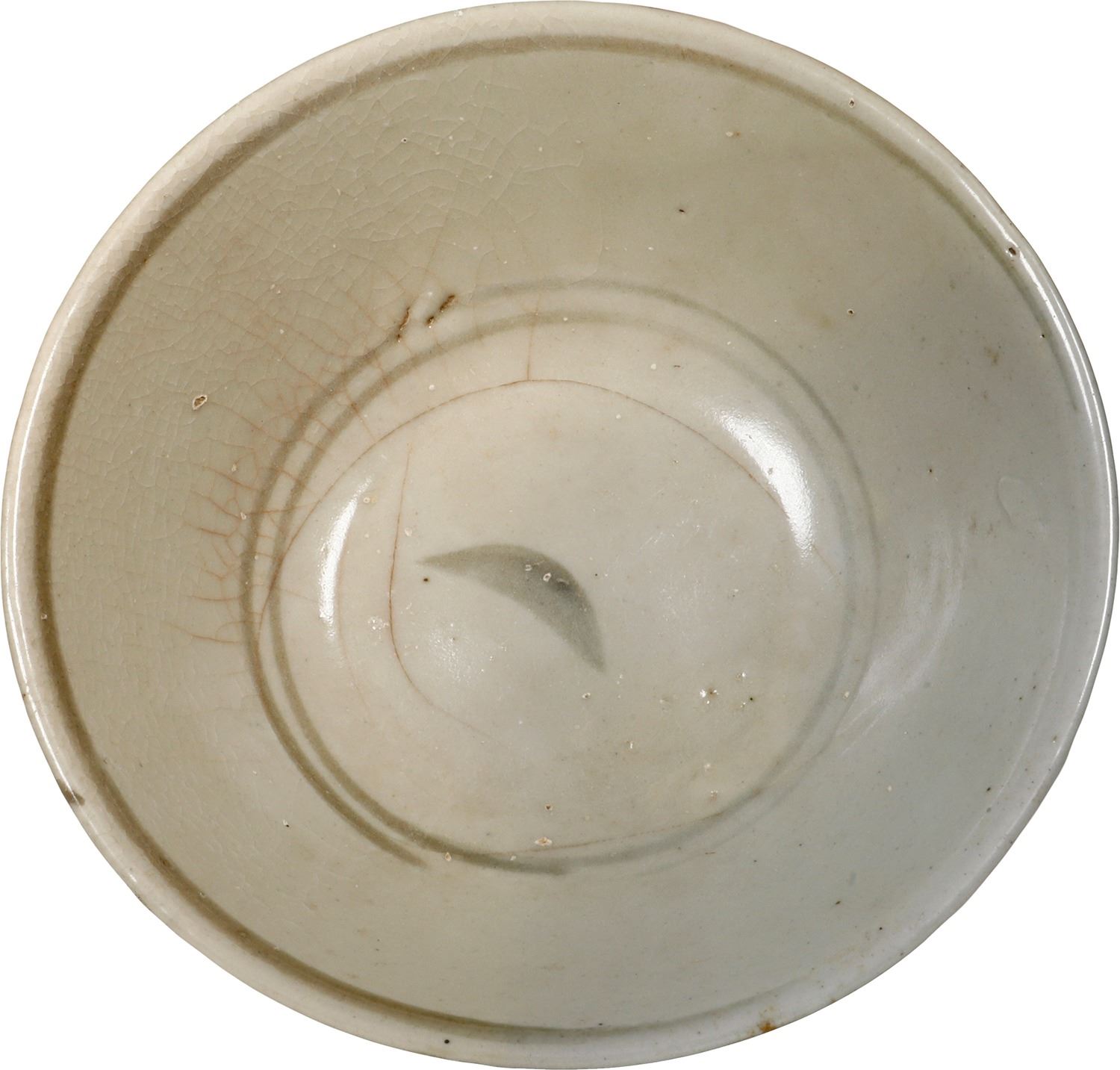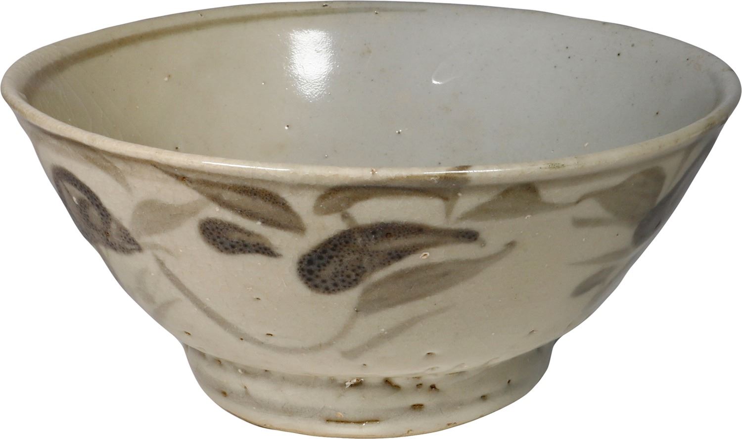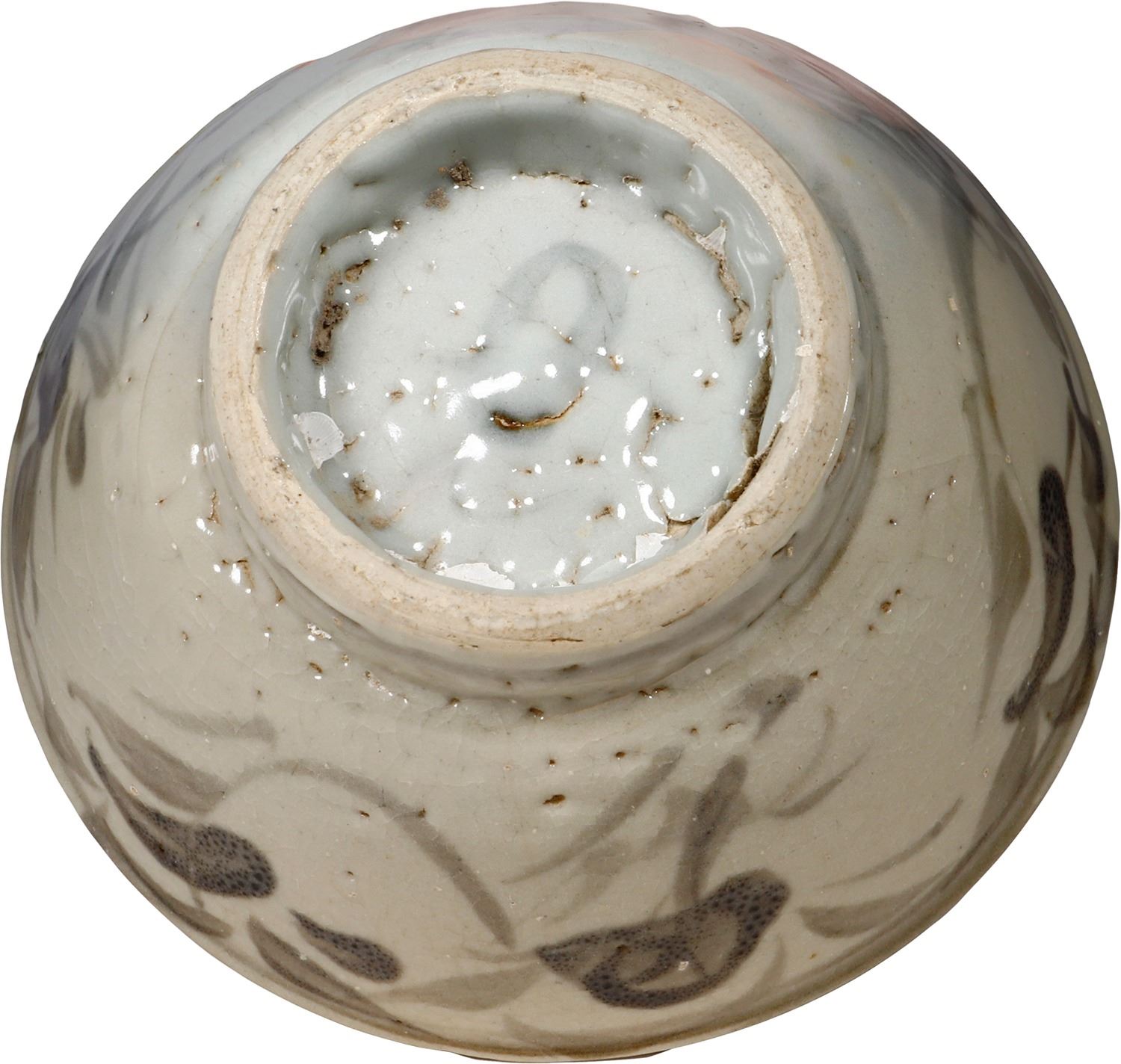 Chinese blue-on-white porcelain bowl, Qing Dynasty, ex-17th-century Chinese wreck. 304 grams. 5¼" diameter; 2¼" deep. Brown and black painted wispy floral designs against a taupe high-gloss glaze, some old crazing, small void in base where thick glaze missing, probably as made. From an unidentified 17th-century Chinese wreck off the Riau Islands in the South China Sea, with photo-certificate A00285 from the salvors.