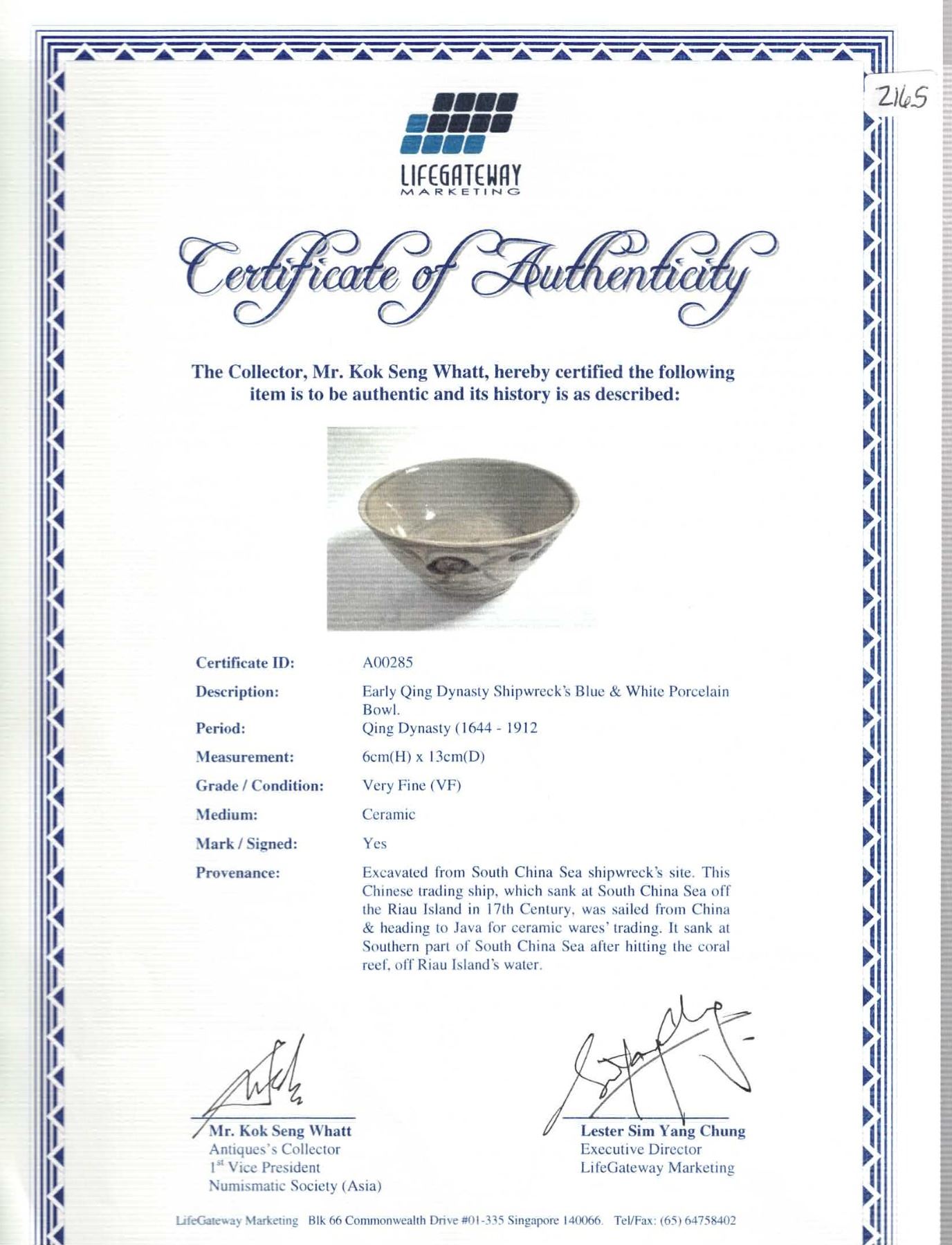 Chinese blue-on-white porcelain bowl, Qing Dynasty, ex-17th-century Chinese wreck.