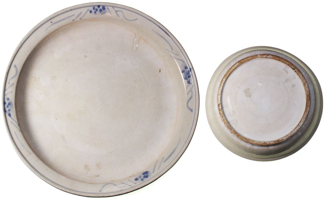 Chinese blue-on-white porcelain dish (shallow bowl), Kangxi period. 1011 grams, 10" in diameter and 1-5/8" tall. Somewhat plain and unglazed except for the rim, which shows 4 clusters of berries, fully intact and rather heavy for porcelain (really more like stoneware). With certificate. Recovered from: "Vung Tao Cargo," sunk ca. 1690 off Vietnam