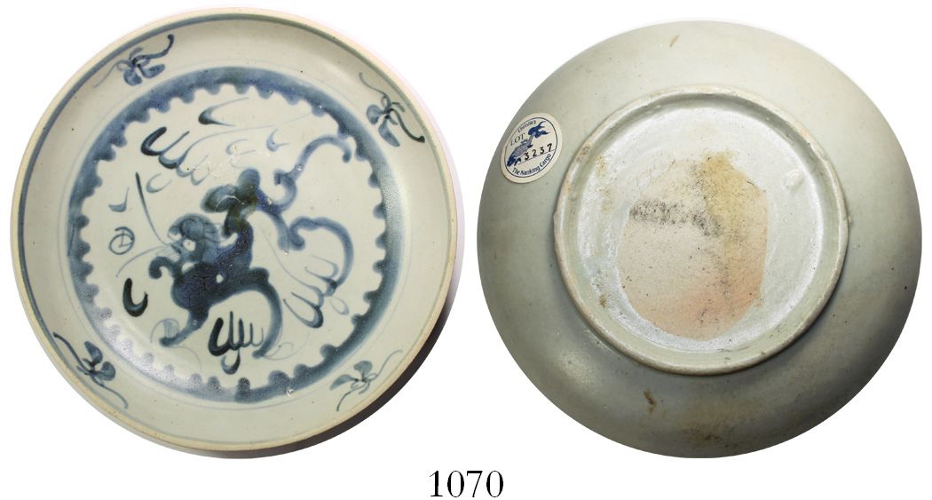 Chinese blue-on-white porcelain dish with dragon motif, intact. 310 grams, 7-1/2" in diameter and 1-1/2" tall. A fairly small, shallow bowl with ring-like base, plain on the exterior but with crude dragon design in center surrounded by small ornaments inside a crenelated border, outside of which are four more ornaments, the glaze a bit worn but lacking any chips or frits or cracks. With original Christie's lot-sticker #3237. Recovered from: Geldermalsen ("Nanking Cargo"), sunk in 1752 in the South China Sea