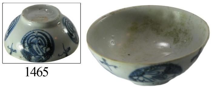 Chinese blue-on-white porcelain rice bowl, crackled-circles design. 113 grams, 1¾" tall and 4¼" in diameter. Plain white interior with specks of gray, the outside of it with 4 bold circles with crackled, swirled designs and cross-shaped ornaments in between, fully intact and usable, from the same wreck that yielded the big bronze bell in our Treasure Auction #4. Recovered from: Unidentified wreck sunk in the 1780s off Busuanga Island, Philippines.