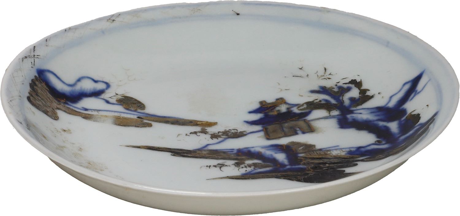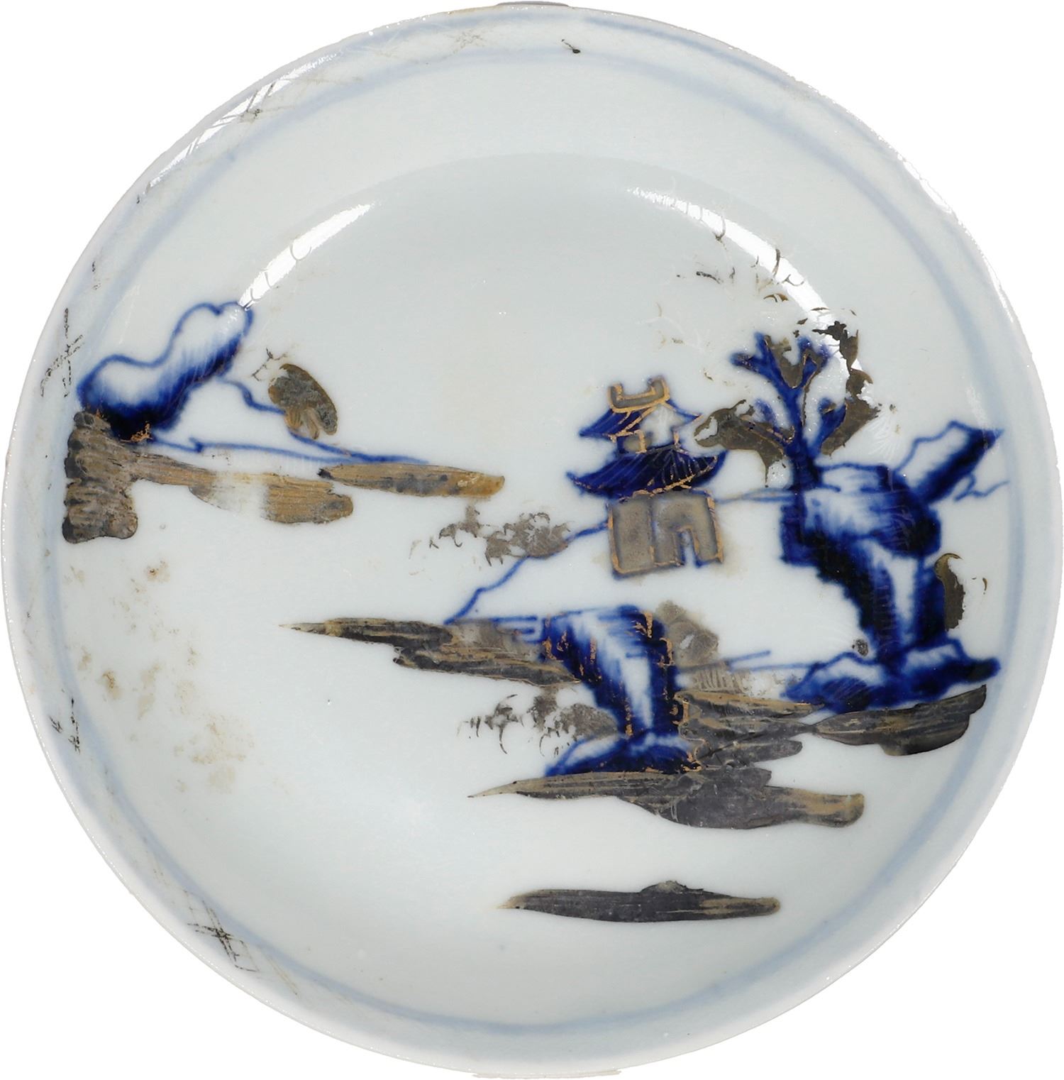 Chinese blue-on-white porcelain saucer, Imari Pavilion pattern, ex- Nanking Cargo  (1752).