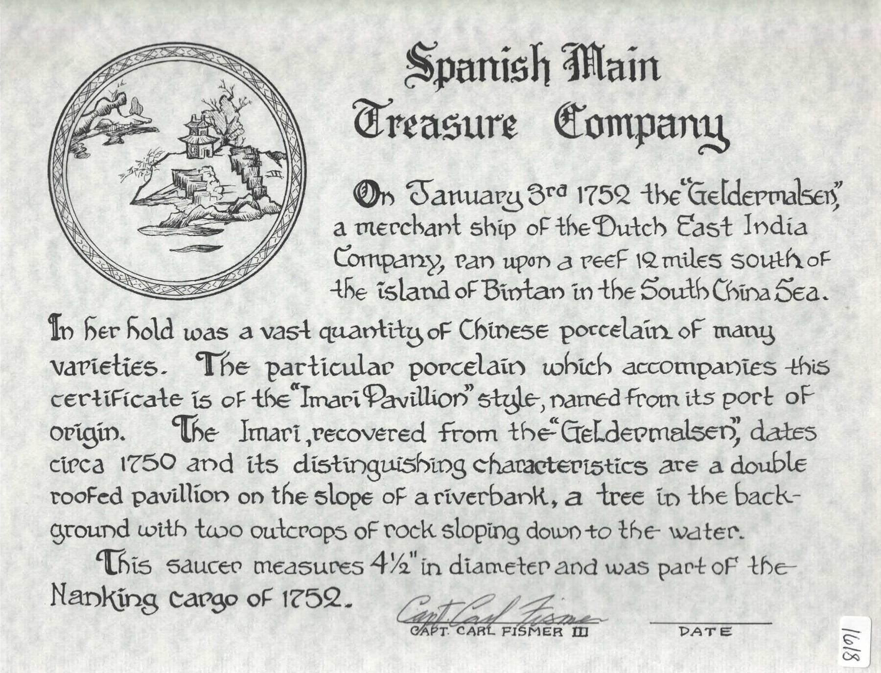 Chinese blue-on-white porcelain saucer, Imari Pavilion pattern, ex-"Nanking Cargo" (1752). 58 grams. 4½" diameter; ½" deep. Classic "Imari Pavilion" design with deep cobalt coloring and full glaze, intact with flecks of gold paint outlining blue designs. From the "Nanking Cargo" (1752), with certificate.