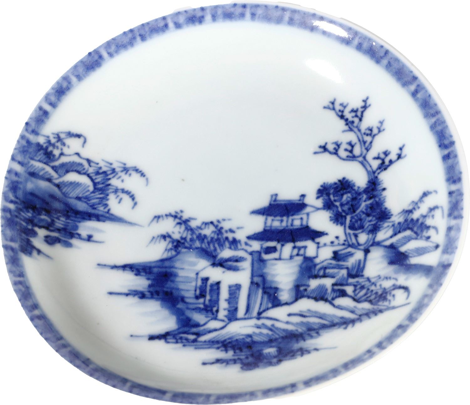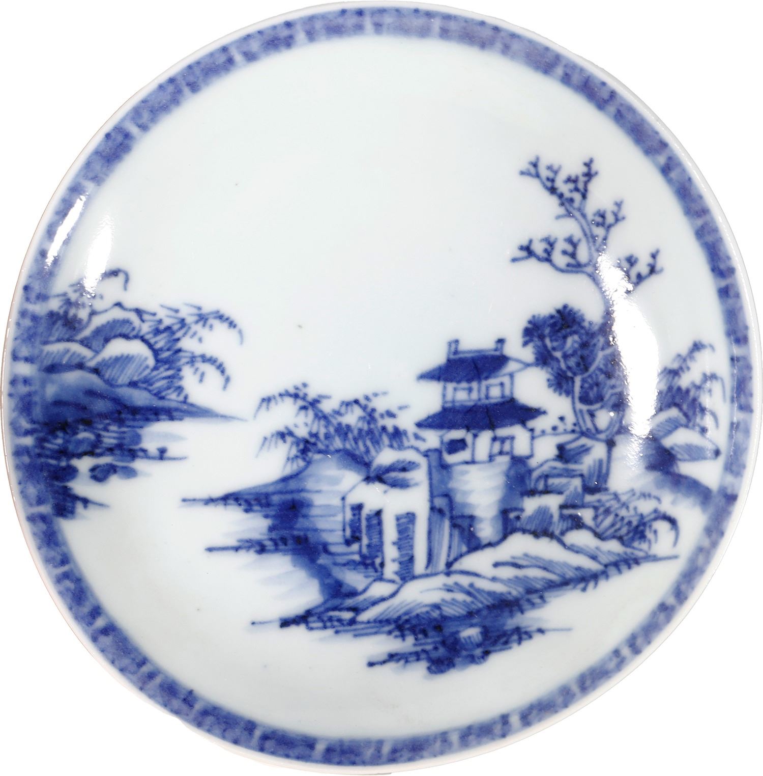 Chinese blue-on-white porcelain saucer, Pagoda Riverscape pattern, ex- Nanking Cargo  (1752).