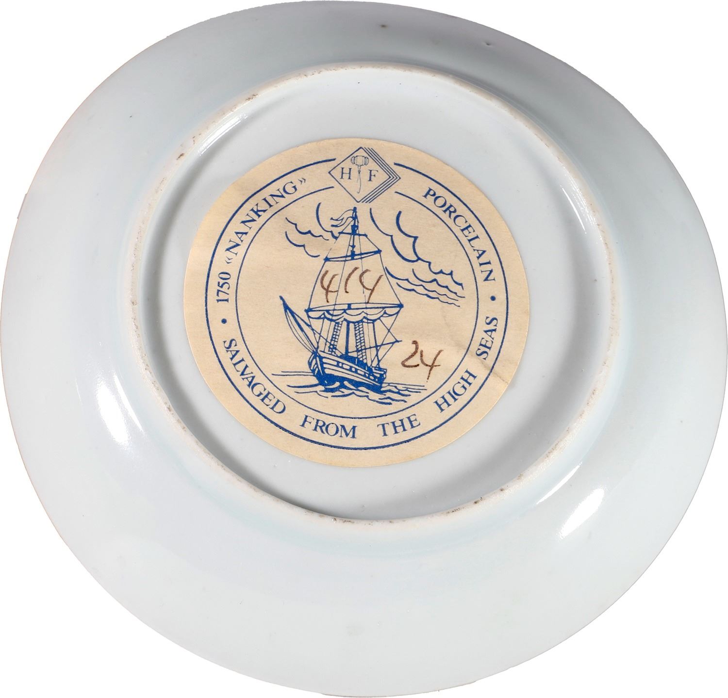 Chinese blue-on-white porcelain saucer, Pagoda Riverscape pattern, ex-"Nanking Cargo" (1752). 66 grams. 4½" diameter, ¾" tall. With lustrous glaze and deep cobalt color, a well-detailed and dainty piece in the Pagoda Riverscape pattern, not to be confused with the much more common Imari Pavilion style. From the "Nanking Cargo" (1752), with large lot-sticker 414/24 on bottom.