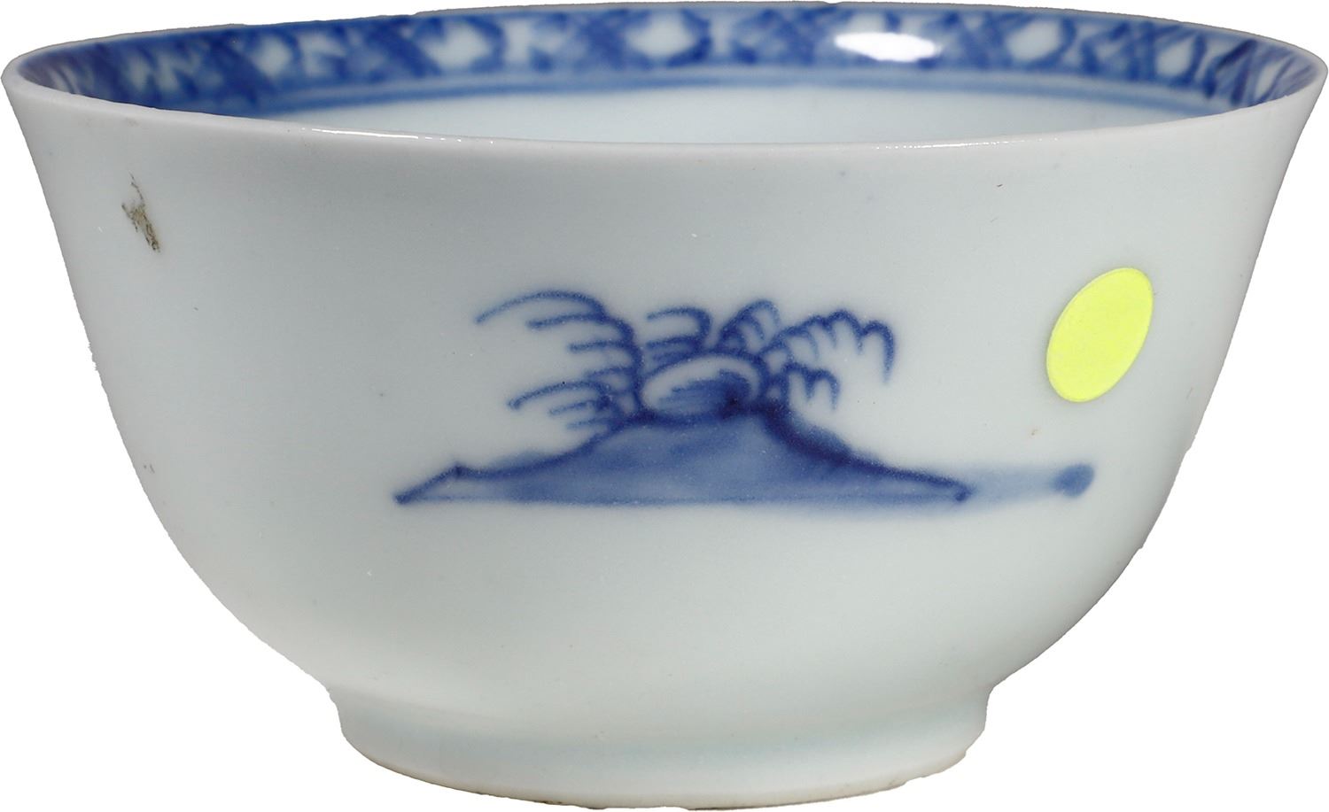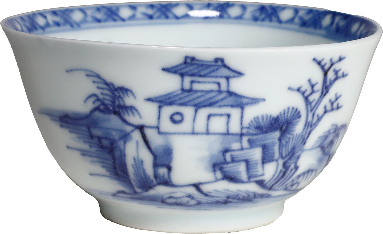 Chinese blue-on-white porcelain teacup, Pagoda Riverscape pattern, ex-"Nanking Cargo" (1752).
