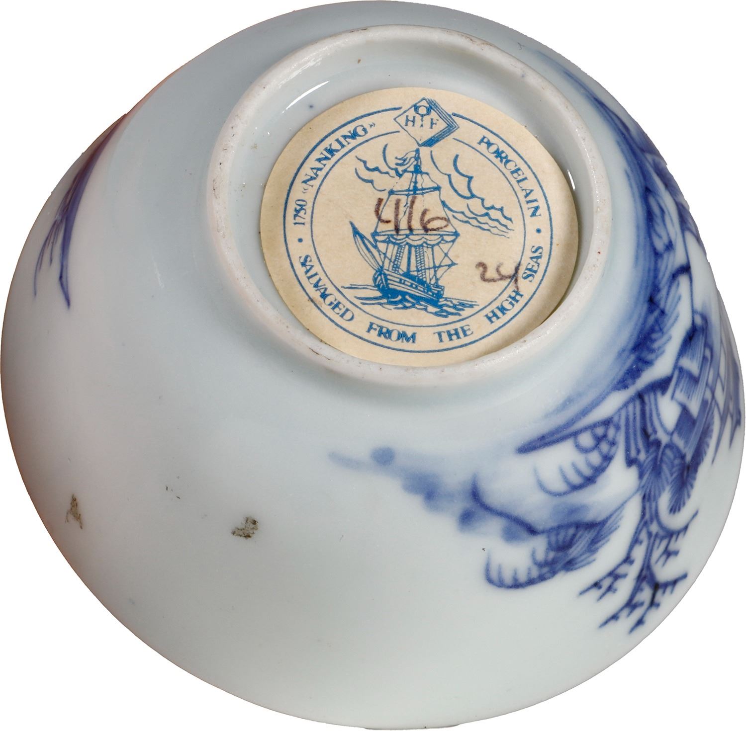 Chinese blue-on-white porcelain teacup, Pagoda Riverscape pattern, ex-"Nanking Cargo" (1752). 53 grams. 3" diameter, 1½" tall. Lustrous, intact with deep cobalt glaze, executed in the Pagoda Riverscape pattern, not to be confused with the Imari Pavilion style that is much more common. From the "Nanking Cargo" (1752), with lot-sticker 416/24 on bottom.