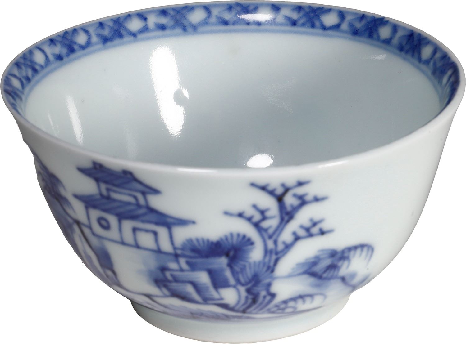 Chinese blue-on-white porcelain teacup, Pagoda Riverscape pattern, ex- Nanking Cargo  (1752).
