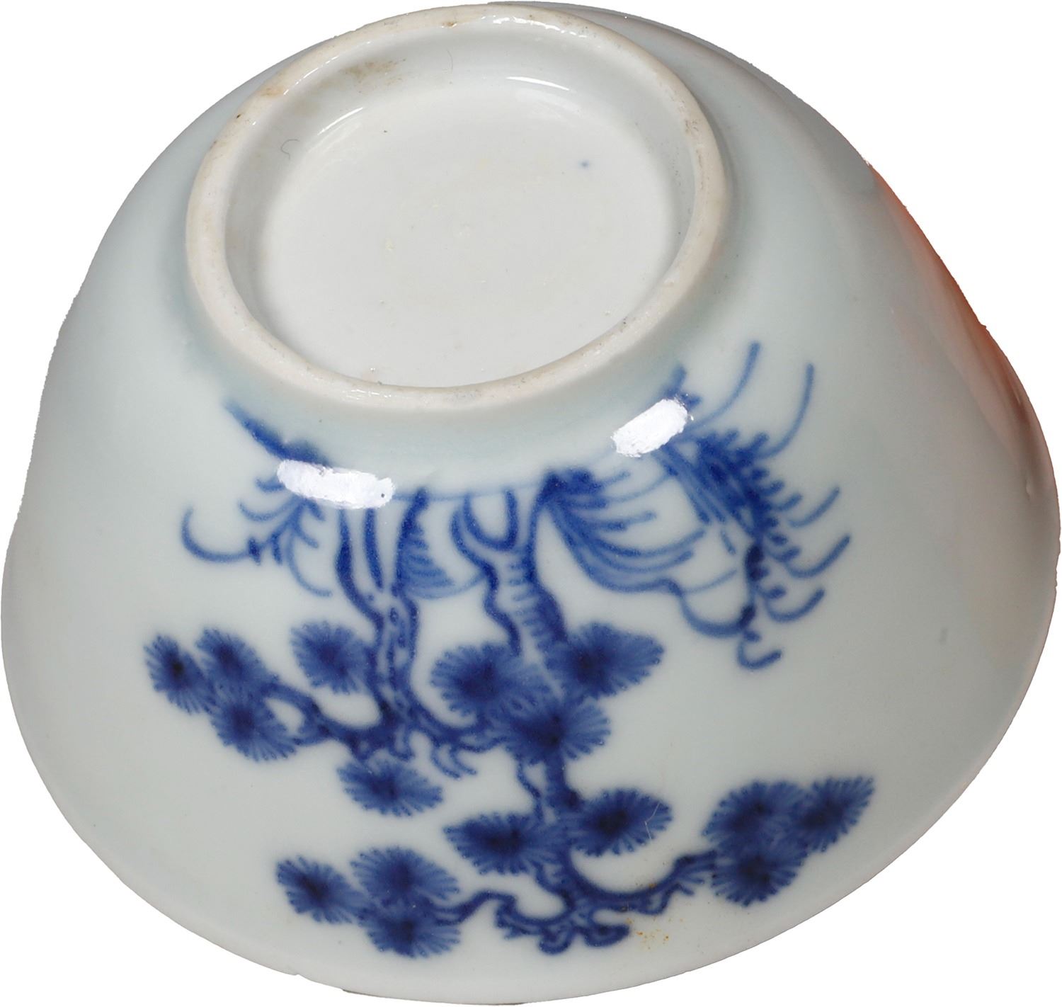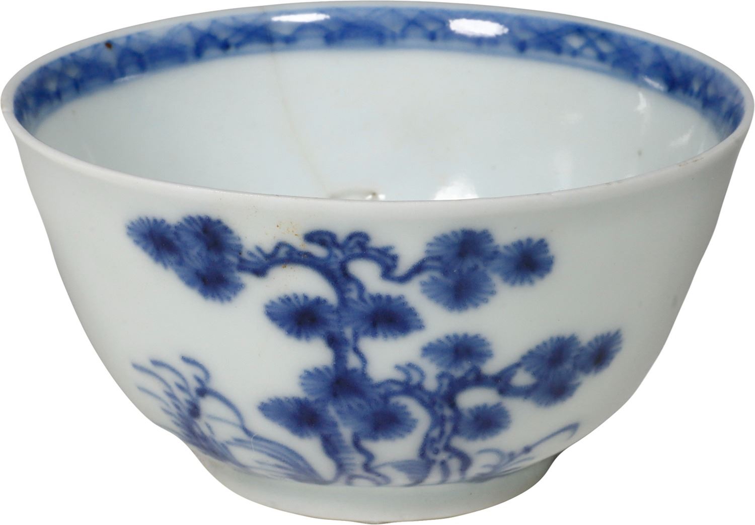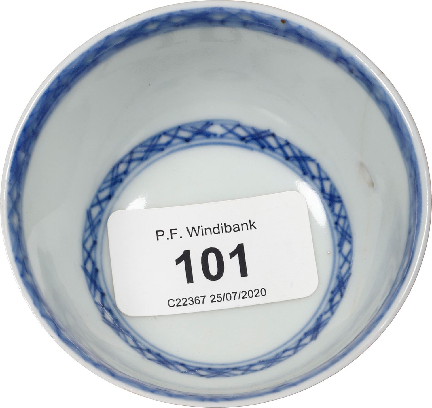 Chinese blue-on-white porcelain teacup, ex-"Nanking Cargo" (1752). 45 grams. 3" diameter, 1½" tall. Dark blue paintings of tree and flowering bush around the outside, circular bands of hatching on the inside, small vertical age-crack, from a pair of teacups sold in the P.F. Windibank auction of July 2020, lot 101. From the "Nanking Cargo" (1752), with P.F. Windibank lot-sticker 101 inside.