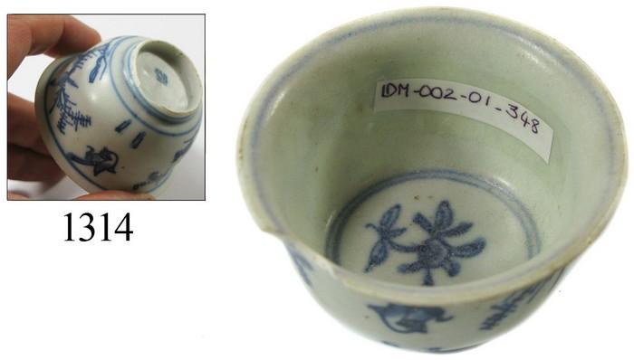 Chinese blue-on-white porcelain teacup, trees/birds design. 36 grams, 1½" tall and 2½" in diameter. Nearly intact (one large chip in rim), with beautiful design on exterior that shows 2 bifurcated trees with lots of leaves and 4 birds (one in flight and the other 3 roosting in the trees), flower in center (interior), Chinese character on bottom of base. Recovered from: Espadarte, sunk in 1558 off Mozambique. With Arqueonautas certificate #IDM-002/01/0348.
