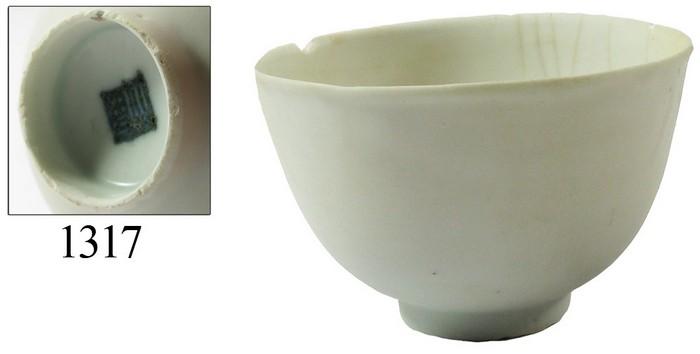 Chinese white porcelain teacup. 58 grams, 2" tall and 3" in diameter. Large cup with no design (plain white all over) except for Chinese character in blue on bottom of base, intact except for minor chips in rim. Recovered from: Espadarte, sunk in 1558 off Mozambique. With Arqueonautas certificate #IDM-002/01/0054.
