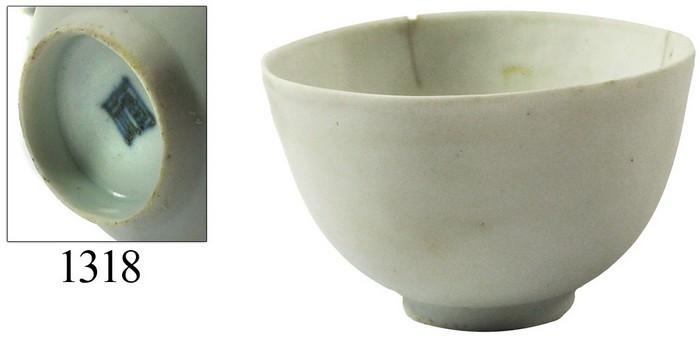 Chinese white porcelain teacup. 63 grams, 2" tall and 3" in diameter. Large cup with no design (plain white all over) except for Chinese character in blue on bottom of base, intact except for one tiny chip in rim, light encrustation. Recovered from: Espadarte, sunk in 1558 off Mozambique. With Arqueonautas certificate #IDM-002/01/0272.