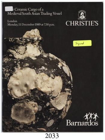 Christie's (London). The Ceramic Cargo of a Medieval South Asian Trading Vessel (December 11, 1989), autographed by Michael Hatcher. VF. Very thin but profusely illustrated catalog (very rare) of Thai-area (mostly Sawankhalok) stoneware from a 1200s-1400s wreck in the South China Sea salvaged by Michael Hatcher (of Nanking Cargo fame), the proceeds all donated to Barnado's Children's Homes.