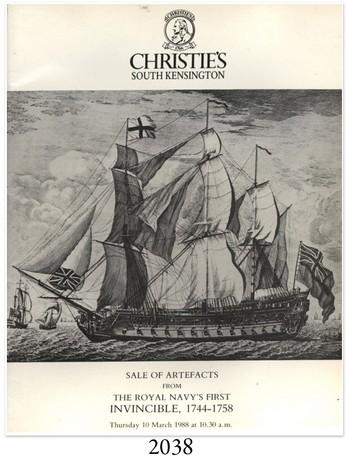 Christie's (South Kensington). Sale of Artifacts from the Royal Navy's First Invincible 1744-1758 (March 10, 1988). NM. Scarce catalog of mundane but fascinating artifacts from the HMS Invincible, sunk in 1758 off the Isle of Wight, England. Pedigreed to the Tom Sebring Treasure Library.
