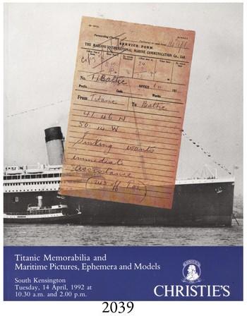 Christie's (South Kensington). Titanic Memorabilia and Maritime Pictures, Ephemera and Models (April 14, 1992), with Prices Realized. VF. This fascinating catalog was partly an offering of memorabilia related to the sinking of the Titanic (not artifacts from the wreck itself), but mostly is paintings and nautical antiques (octants, etc.) and ship models. Pedigreed to the Tom Sebring Treasure Library.