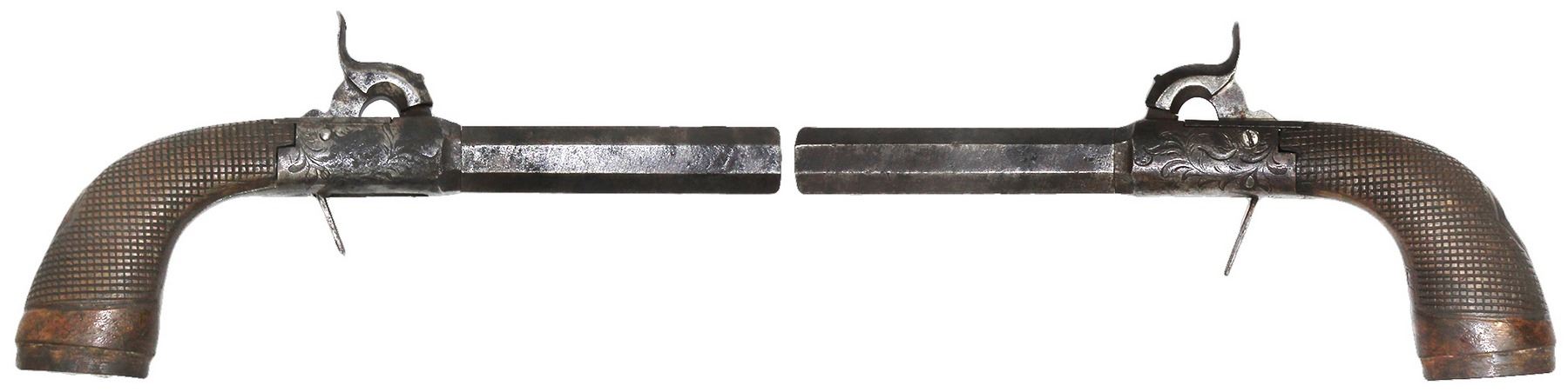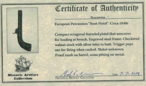 Circa-1840s European percussion "boot pistol." , 250 grams, 7-5/8" long. Compact octagonal-barreled pistol which unscrews for loading at breech and trigger pops out for firing when cocked, with engraved steel frame, checkered walnut stock with silver inlay to butt, unknown maker and proof mark on barrel, some pitting on metal. With photo-certificate.