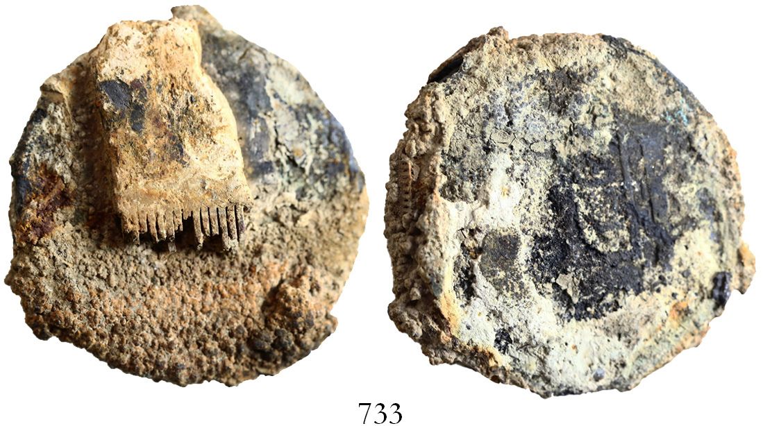 Clump of 1 Spanish colonial bust 8 reales, Charles III, encrusted with the remains of an ivory lice comb, unique combination. 30.03 grams total. The coin a bit light (probably worn) but totally cocooned with white and orange encrustation with small piece of a comb, neither item unusual from a wreck but definitely unique as a clump and especially rare from this wreck. Recovered from: Cazador, sunk in 1784 off New Orleans