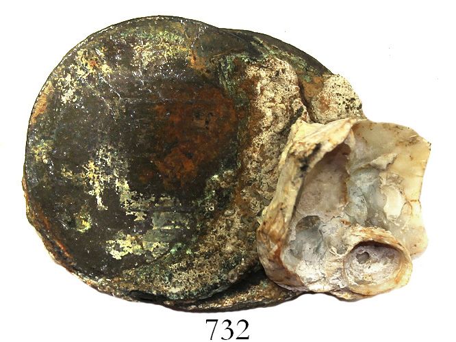 Clump of 2 Spanish colonial bust 8 reales, Charles III, encrusted with large oyster shell. 52.11 grams total. Worn coins but impressively encrusted with white and orange coral and one large shell. Recovered from: Cazador, sunk in 1784 off New Orleans