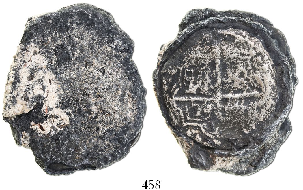 Clump of 2 "biscuitized" cob 8 reales, one clearly Potosi, Bolivia, probably Philip III. 47.03 grams. Two solid coins inside "cocoons" of oxidation, the cross side of one coin fully exposed (the other coin probably Mexican by shape), with whitish coral encrustation on the other side, nice for display. With certificate. Recovered from: Concepcion, sunk in 1641 off Hispaniola