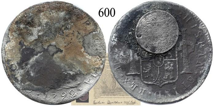 Clump of 2 coins: Lima, Peru, bust 8 reales, Charles IV, 1792 and Mexico City, Mexico, bust ½ real, Charles III, date not visible, assayer FF (1777-84). 21.9 grams. One of the neatest things ever recovered from this obscure wreck, this piece shows the tiny ½R stuck onto the reverse of the 8R completely face on, the whole piece left totally uncleaned and encrusted (lots of orange and brown) so as not to destroy the unique cohesion of two such different coins, both coins somewhat corroded but still readable. Recovered from: "1810 wreck," east coast of Florida. With Fisher photo-certificate #22546.