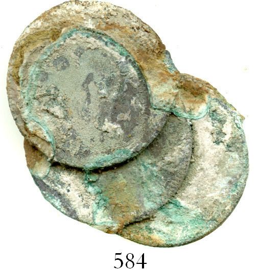 Clump of 3 Spanish colonial bust 2 reales. 21.1 grams. An evenly spread fan of coins, the reverse of one exposed to show good details, otherwise all covered in brown, white and green encrustation. From the Cazador, sunk in 1784 off New Orleans
