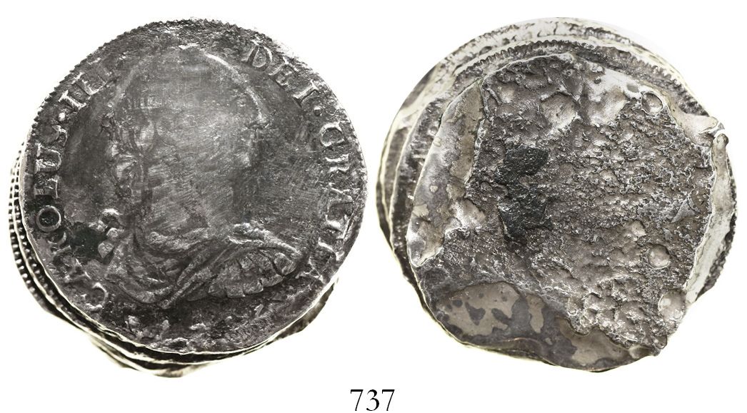 Clump of 3 Spanish colonial bust 8 reales, Charles III, date 1785 visible on top coin. 89.97 grams. Tight stack of fairly solid coins, the top one with full bust visible, bottom coin heavily corroded, nicely toned all over, no encrustation. Recovered from: Hartwell, sunk in 1787 off the Cape Verde Islands, west of Africa