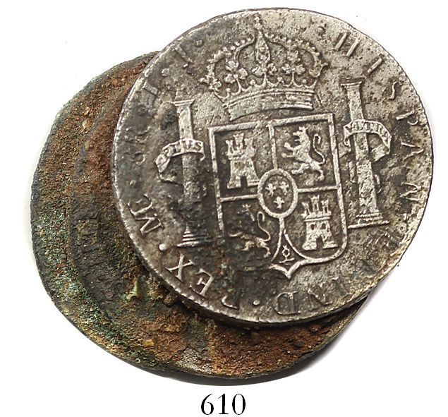 Clump of 3 Spanish colonial bust 8R (probably Lima, Peru, 1800IJ), uncleaned as found except for one exposed reverse. 82.89 grams total. Tight, leaning stack of mostly solid coins, especially the bottom one, which shows the full reverse in AU detail, lots of brown and white and green sandy encrustation. Recovered from: Leocadia, sunk in 1800 off Punta Santa Elena, Ecuador