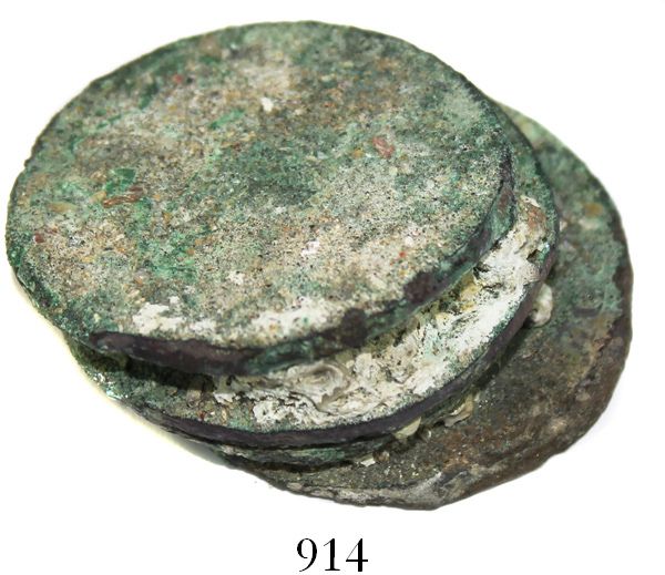 Clump of 4 Spanish colonial bust 8 reales (probably all Lima, Peru, 1800IJ), with encrustation. 112.2 grams total. Tidy stack of coins with white encrustation and shell bits between the coins, which are all coated in green and tan (no details visible) but apparently solid. Recovered from: Leocadia, sunk in 1800 off Punta Santa Elena, Ecuador