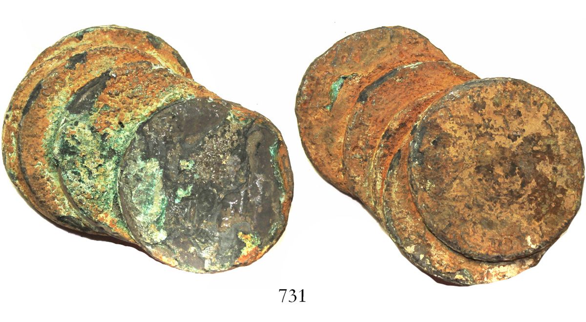 Clump of 5 Spanish colonial bust 8 reales, Charles III, encrusted. 122 grams total. Thick brown crust covering mostly worn (some solid) coins in a fallen stack. Recovered from: Cazador, sunk in 1784 off New Orleans