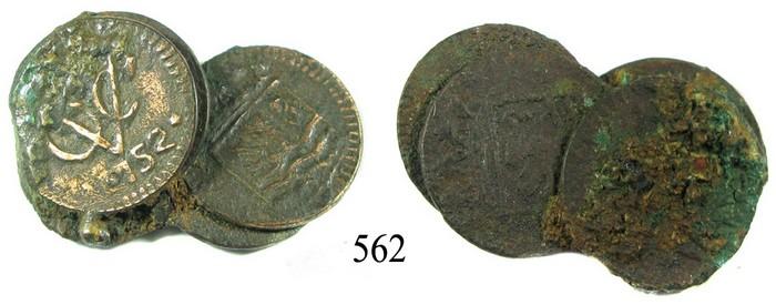 Clump of 5 copper Dutch East India Co. duits dated 1752. 30 grams. Very cute little clump with bold details on the coins (minimal corrosion), some bits of dark brown and green debris, the form of it like a stack of cards in mid-shuffle. Recovered from: Bredenhof, sunk in 1753 off Mozambique.