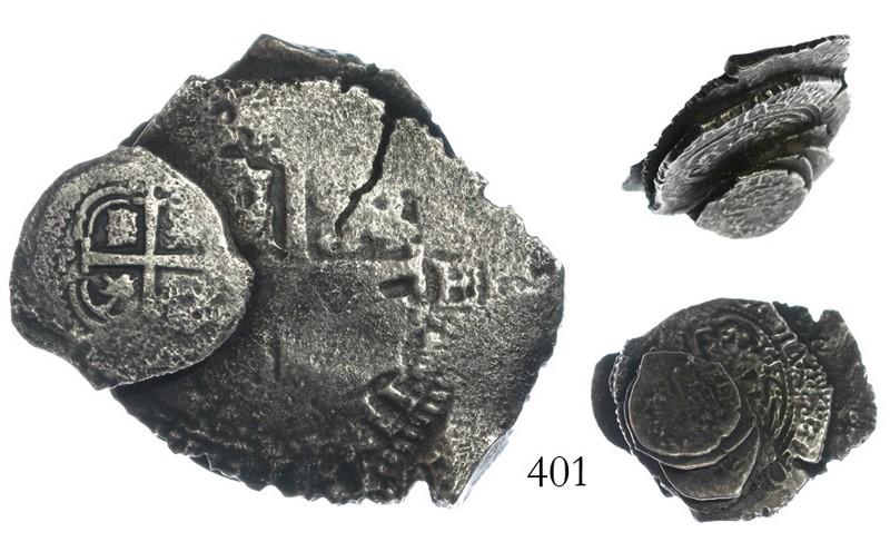 Clump of 7 Potosi, Bolivia, silver cobs (two 8R and five 1R), all well preserved. 57.9 grams. Tight, clean stack with a 1R on the bottom topped by two 8R and then four more 1R on top, each coin nicely toned and well detailed despite light to moderate corrosion, very solid and attractive. With certificate. Recovered from: Consolacion, sunk in 1681 off Ecuador