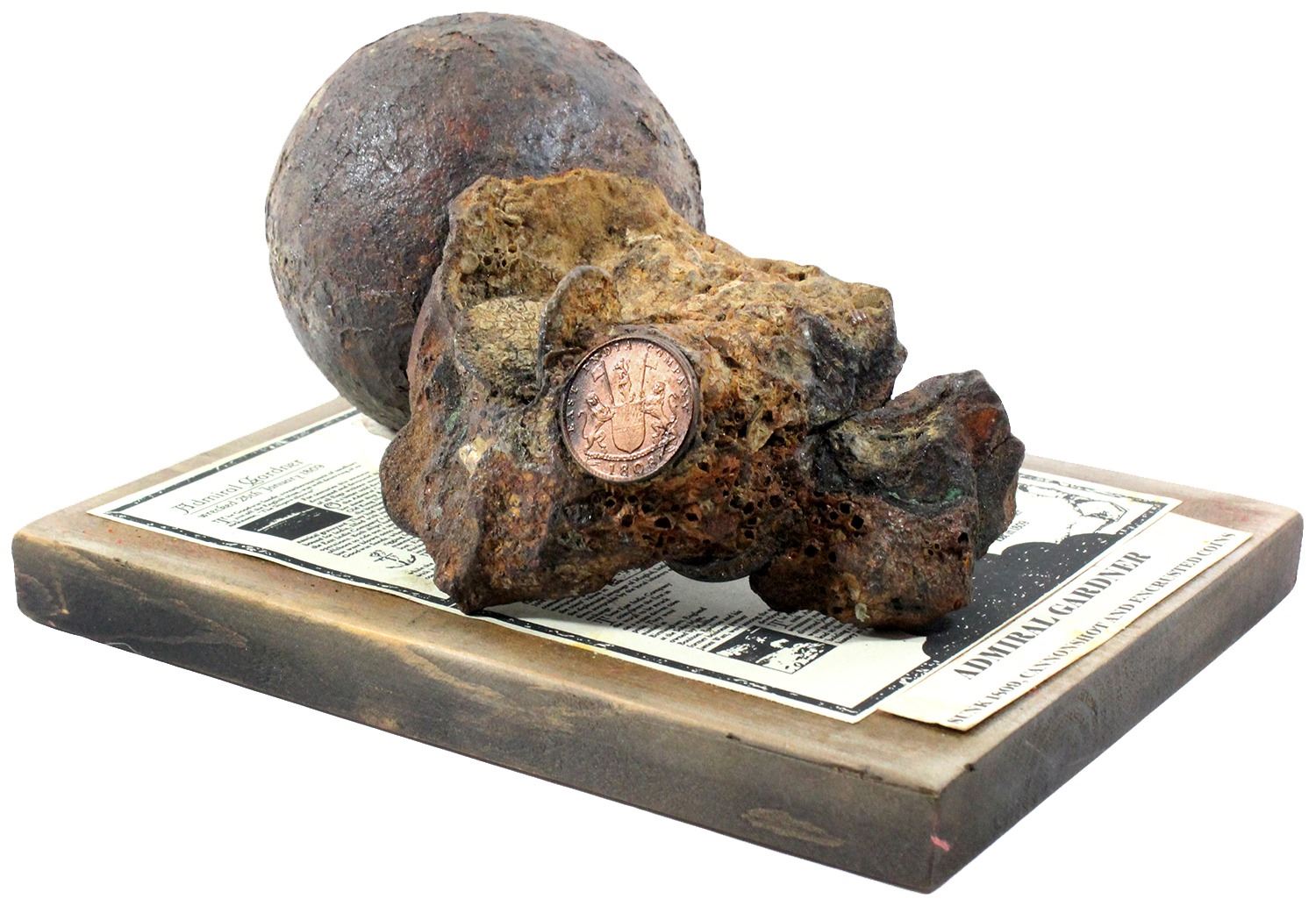 Clump of at least ten (and maybe more) English East India Company copper X cash (1808) and cannonball, with wooden base containing information regarding the shipwreck. 3453 grams (without base). Interesting conglomeration of Admiral Gardner X cash coins (some coins exposed) and gun flints in matrix, plus a conserved but rusty six-pound shot (3" diameter) to which they were attached, both pieces salvaged together and left loose for better viewing (one chunk of the coin matrix loose), with informational display plaque. Purchased from the salvager in London in the 1980s. Recovered from: Admiral Gardner, sunk in 1809 southeast of England