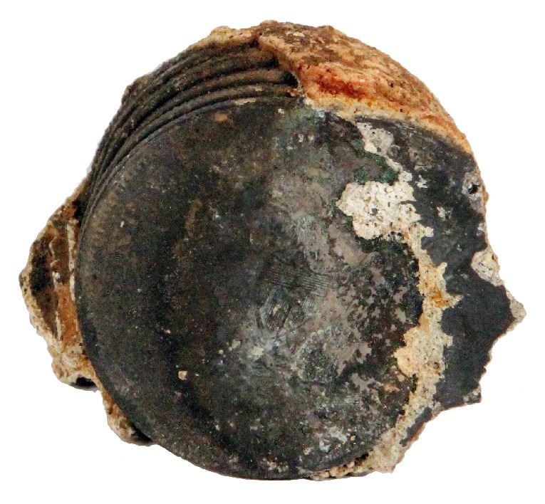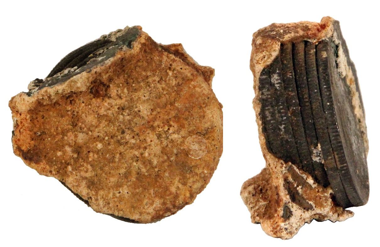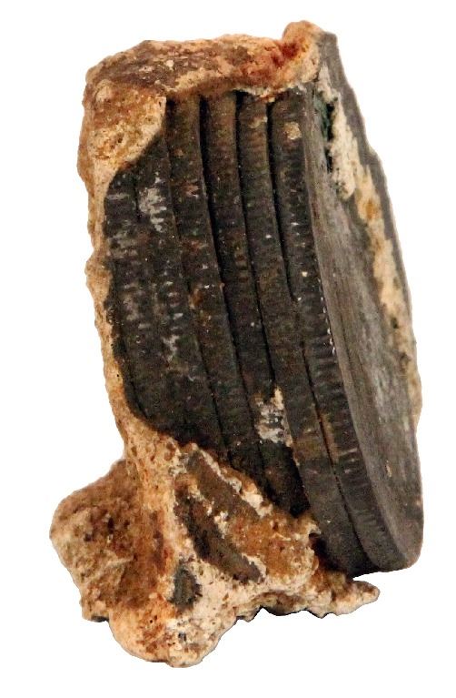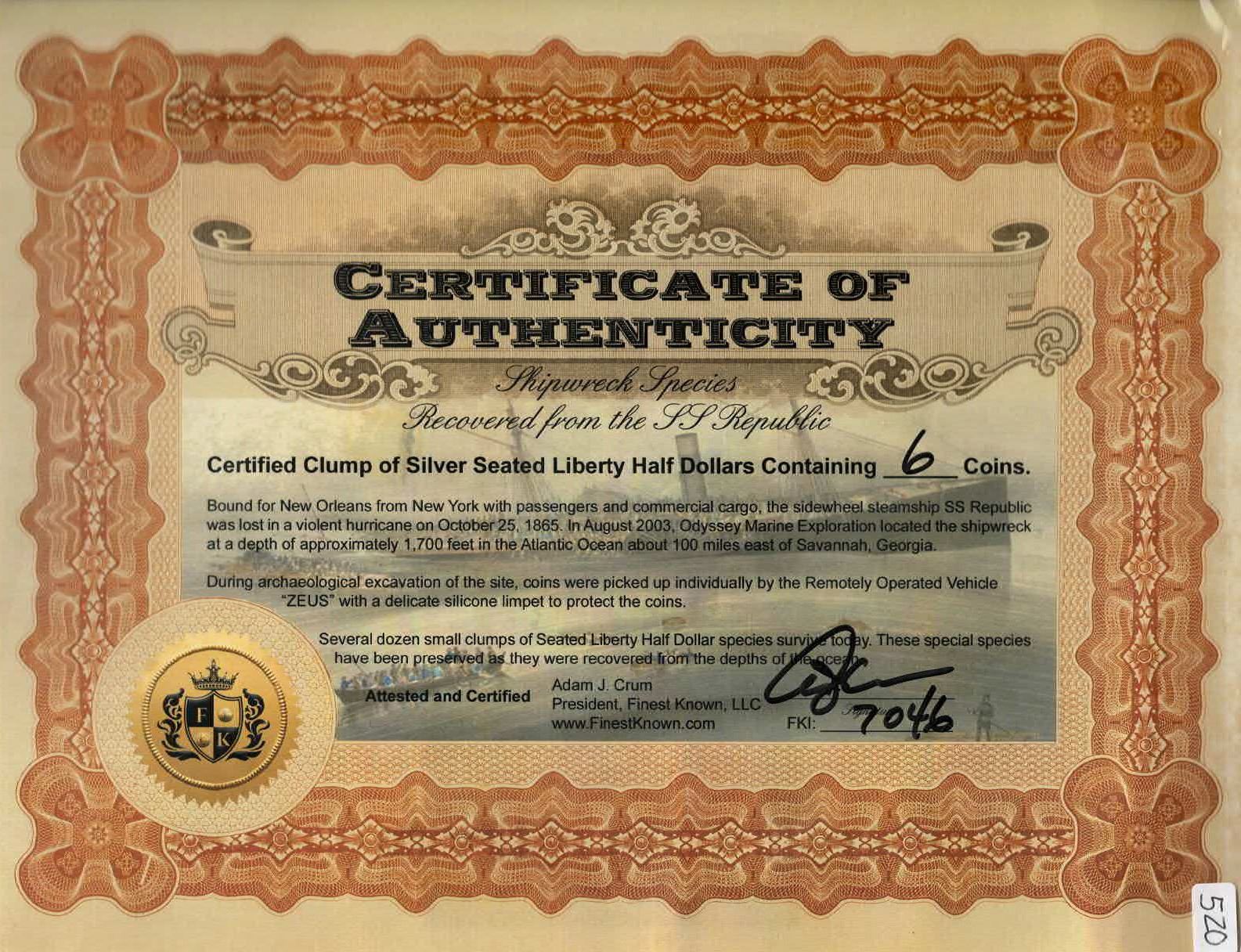 Clump of six USA Seated Liberty half dollars, ex-S.S. Republic (1865), very rare provenance. 80.61 grams total. A tight clump of six solidly encrusted Seated Liberty half dollars in a leaning stack formation, essentially as stored aboard the ship prior to sinking. The top of the stack shows the nearly full reverse of a Philadelphia-minted half dollar, a scarce type from the SS Republic treasure. There are several impressions of other coins around the sides of the clump including that of an 1855 half dollar with arrows at date. Overall a rare artifact from this wreck as most coins were cleaned up, slabbed, and sold individually. With original certificate 7046. Recovered from: S.S. Republic, sunk in 1865 off Georgia