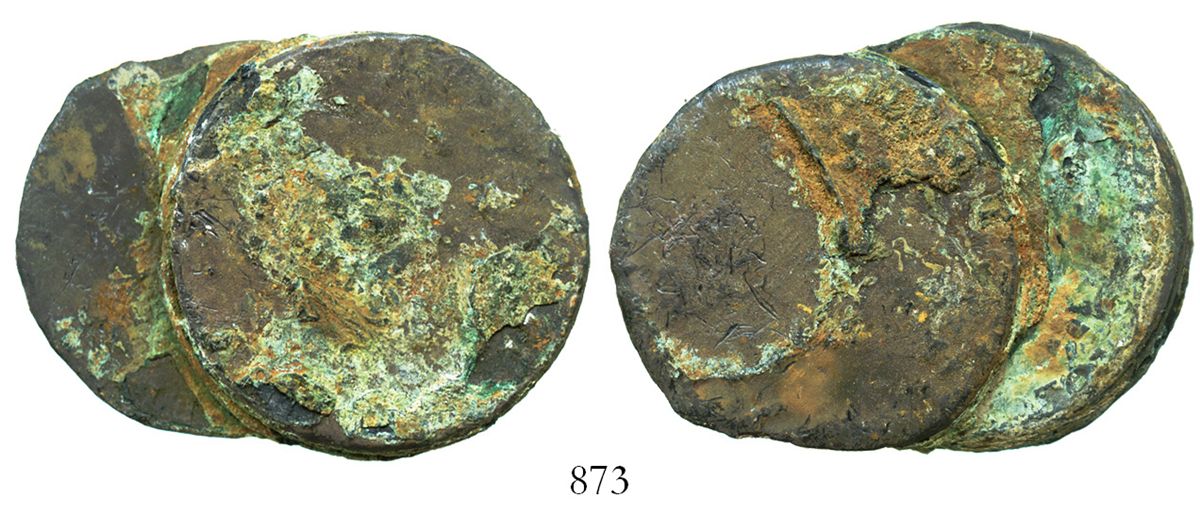 Clump of three Mexico City, Mexico, bust 8 reales, Charles III, 1783FF, encrusted as found. KM-106.2; CT-933. 63.2 grams. Rather worn coins, one offset from the others, but with attractive green and brown encrustation. With certificate #10696 from the salvager. Recovered from: Cazador, sunk in 1784 off New Orleans