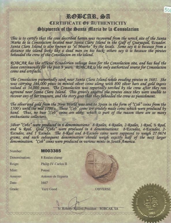 Clump of three Potosi, Bolivia, cob 8 reales, dated 1663E, 1677E and 1679 (assayer not visible), ex-Spink. 52.88 grams total. All three coins a bit thin but with good details (including date) as partially cleaned (also nicely toned), yet still solidly anchored together with dark encrustation hidden inside the stack. Pedigreed to the Spink (New York) auction of December 2001, with original lot-tag #743 and with "Isla de Muerto Shipwreck" tag #04900. Recovered from: Consolacion, sunk in 1681 off Santa Clara Island, Ecuador