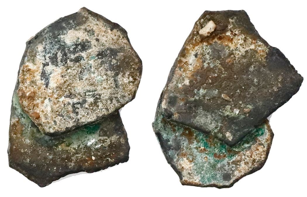 Clump of two Mexican cob 4 reales, probably both Philip V, uncleaned as found, ex-Ward. 23.59 grams total. Two dark but decent coins solidly fused with green, white and orange encrustation (only about half of each coin overlapping), hint of cross on one and shield on the other peeking through the crust. Pedigreed to the Bruce Ward collection (Cargile auction of December 2019, lot #127, with original tag and photo-certificate). Recovered from: Spanish 1715 Fleet, east coast of Florida