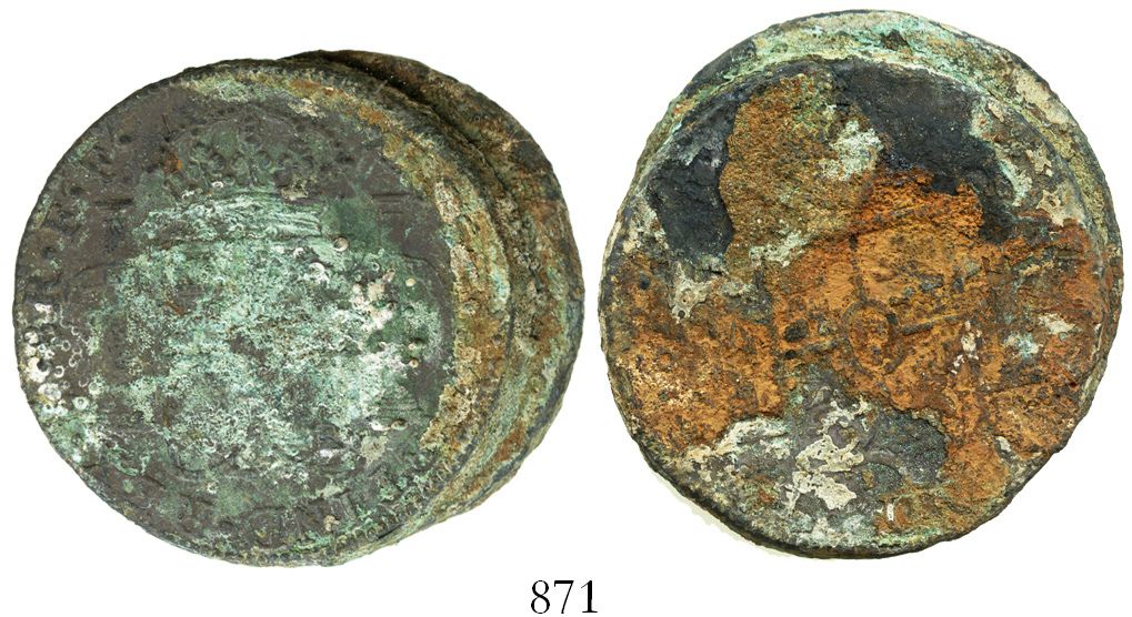 Clump of two Mexico City, Mexico, bust 8 reales, Charles III, 1783FF, encrusted as found. KM-106.2; CT-933. 50.2 grams. Solid coins, lots of green and brown color to the encrustation. With certificate #10694 from the salvager. Recovered from: Cazador, sunk in 1784 off New Orleans