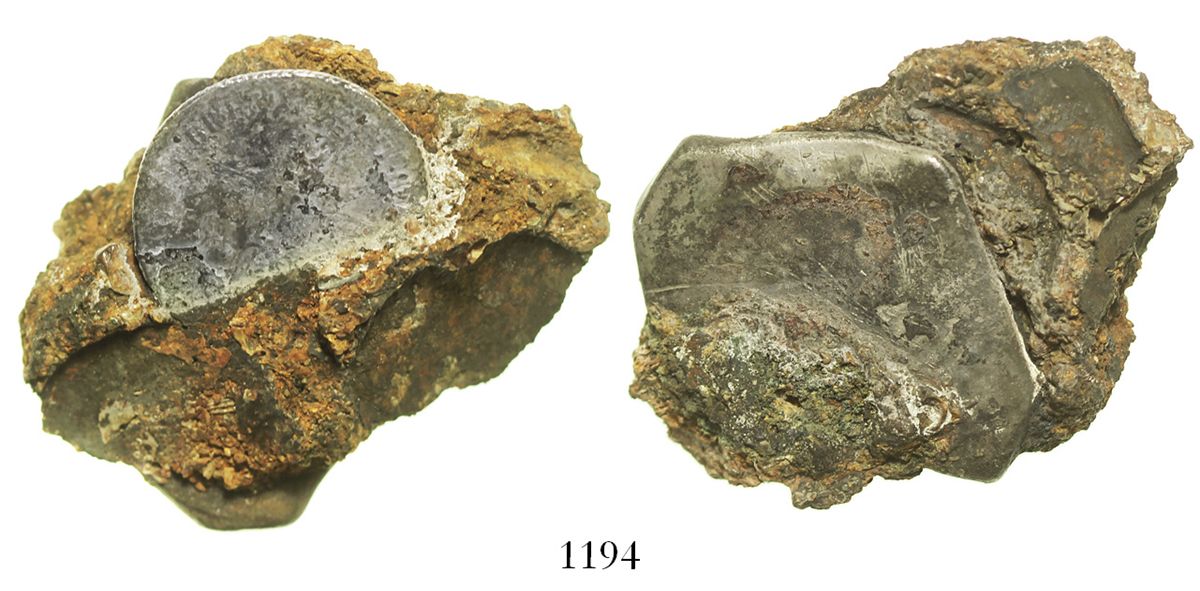 Clump of two coins in matrix (as found): one English shilling (probably William III, 1696-7) and one Mexican cob 8R (probably Charles II, late 1600s). 51.60 grams total. About half of each coin exposed with dark chunk of crud holding them together, interesting as a mix of countries in one conglomerate. With original certificate from the salvagers. Recovered from: Association, sunk in 1707 off the Scilly Isles, southwest of England