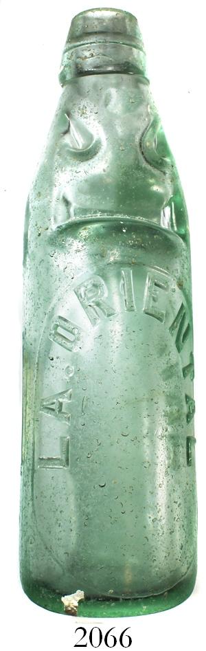 "Codd neck" soda bottle marked La Oriental. 640 grams; 9" tall. Did you ever wonder why soda is sometimes called "pop"? The answer comes from original bottles like this one, in which a glass marble at top had to be pushed down into the crimped neck, making a "pop" sound, to start drinking from the bottle. This specimen is completely intact, with lots of tiny bubbles in the clear green glass, embossed in front with the brand of the soda, La Oriental, and at the bottom of the back with THE NIAGARA BOTTLE / BARNETT & FOSTER / MAKERS / LONDON. N. Pedigreed to the Marty Meylach collection, with photo-certificate. From: Alicia, sunk in 1905 in the Florida Keys