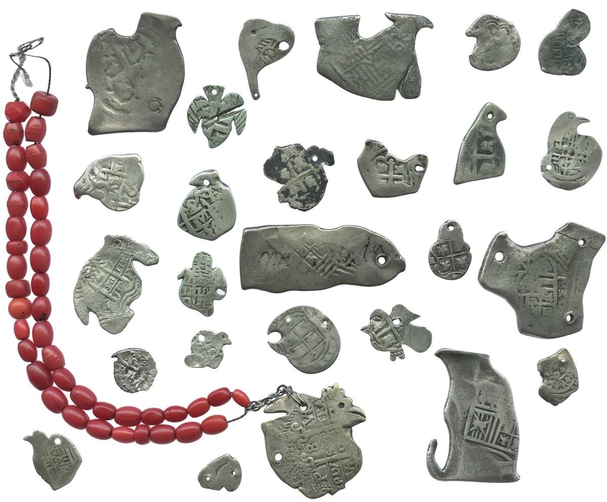 Collection of 27 silver cobs struck in or cut into animal shapes (six 8R and twenty-one minors), collected by Louis Hudson. While true zoomorphic shapes made specially at the mint command big premiums, even more so than Royals and Hearts, there is still some value in cobs that were simply animal-like by whim of nature and ones that were artistically cut down into recognizable shapes by colonists. This collection, assembled by expert coin dealer Louis Hudson over many years, displays a wide range of different animals and other shapes, mostly smaller coins but a few larger ones, which are of course much more dramatic, perhaps the most interesting one (with red coral-bead necklace) in the form of a fat chicken. Almost all are holed, as they were kept as jewelry, with dates and other diagnostic data visible on some, the earliest coin a Mexican Charles-Joanna 1R (mid-1500s) and the latest a Potosi 2R of 1769, grades anywhere from Good to AVF.