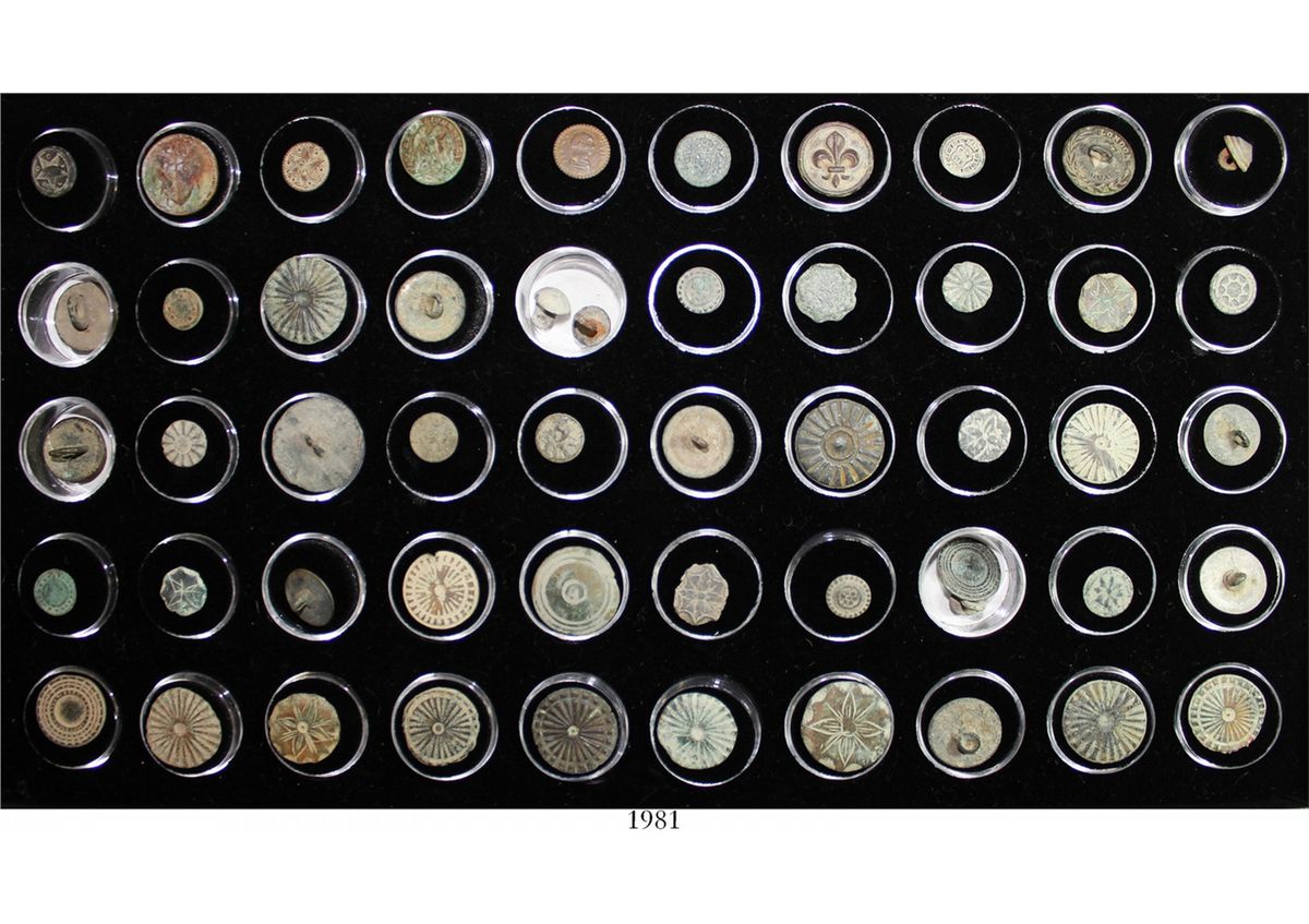 Collection of 50 colonial-period buttons, 1600s to 1800s, various nationalities, in glass display case. 830 grams total, up to 1" each. Interesting collection of different designs (flowers, stars, fleurs, etc., but at least two with Spanish colonial coin designs) and sizes, most likely all from the same place as similarly patinated (green with whitish encrustation). With photo-certificate.