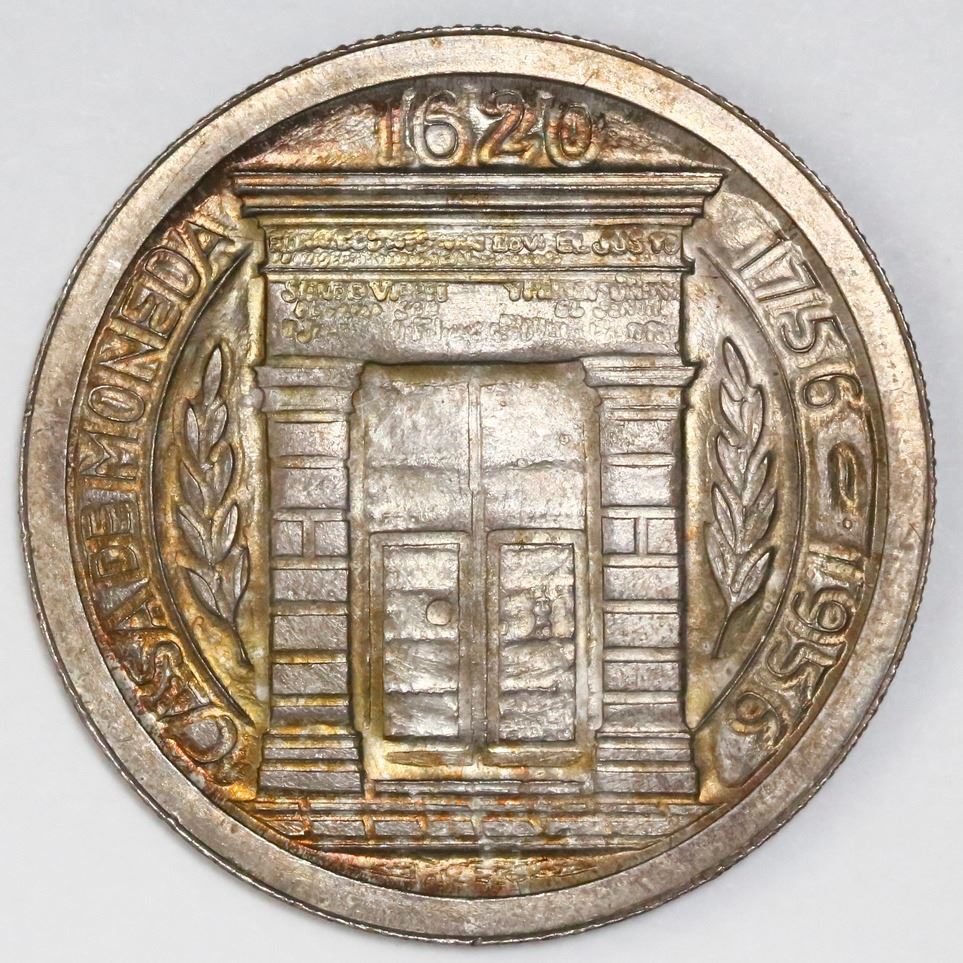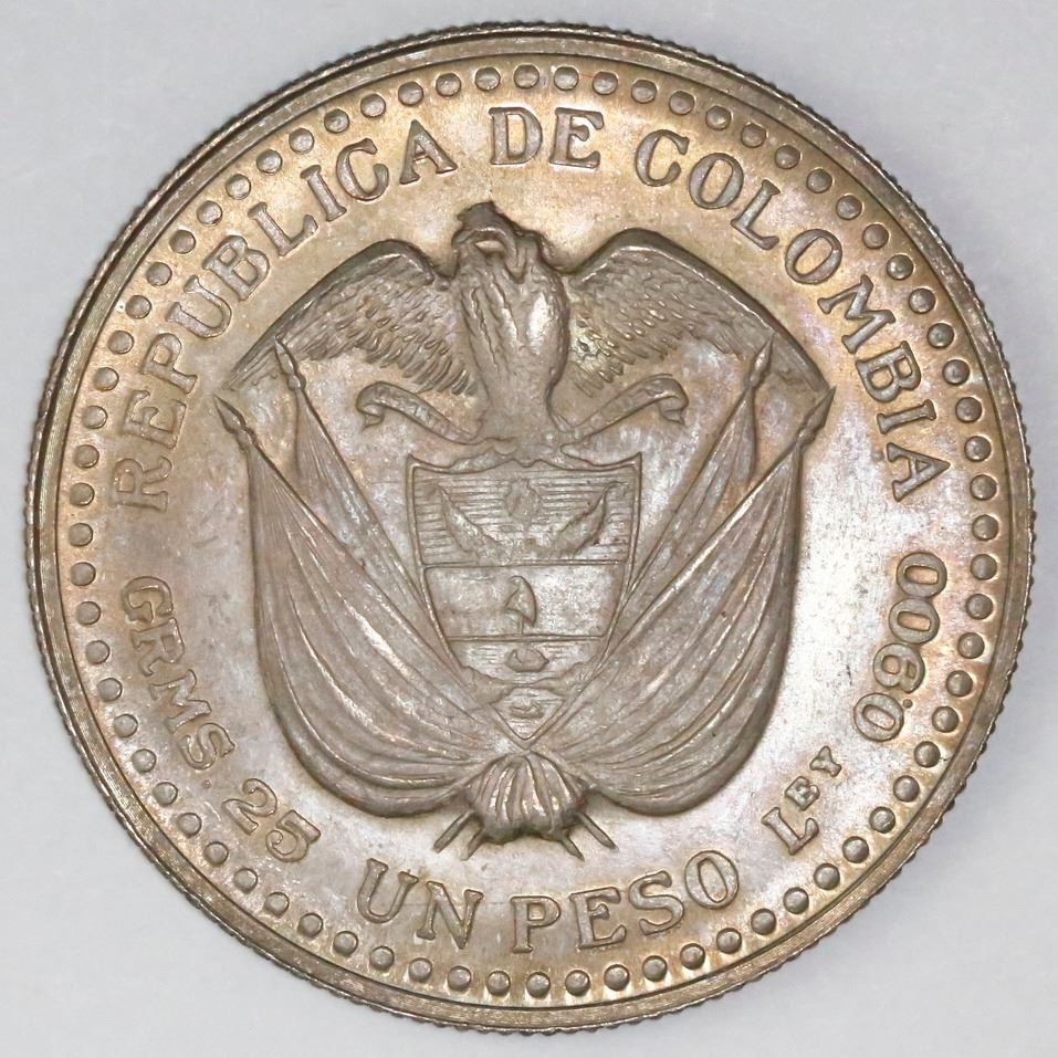 Colombia, 1 peso, 1956, Popayan Mint 200th Anniversary, NGC MS 66. KM-216; KM-216. Intricately designed coin with bright rainbow toning over subdued luster, nice grade. NGC #4700529-007.