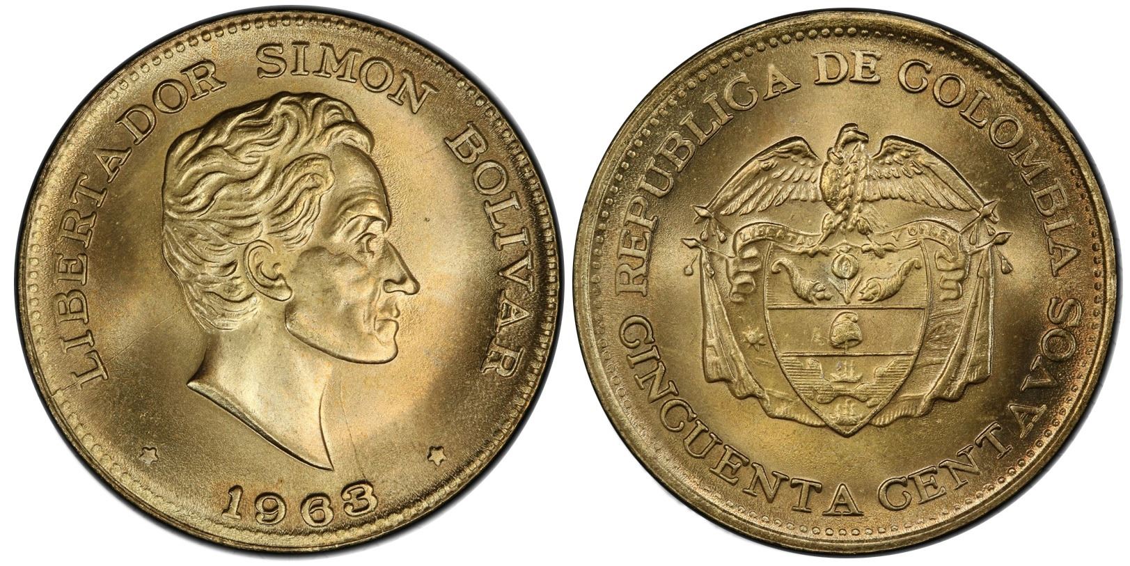 Colombia, 50 centavos, 1963, mint error struck on aluminum-bronze alloy planchet, PCGS MS 67, ex-Eldorado. Restrepo-unl (cf 420.6); KM-unl (cf 217). Bright and highly lustrous in golden brass color, with no marks or wear at all, a couple hairline die-cracks on obverse, first and only off-metal specimen known to us (regular issue is copper-nickel). PCGS #85758104. Pedigreed to the Eldorado collection (Stack's Bowers auction of August 2018, with original lot-tag #42334).
